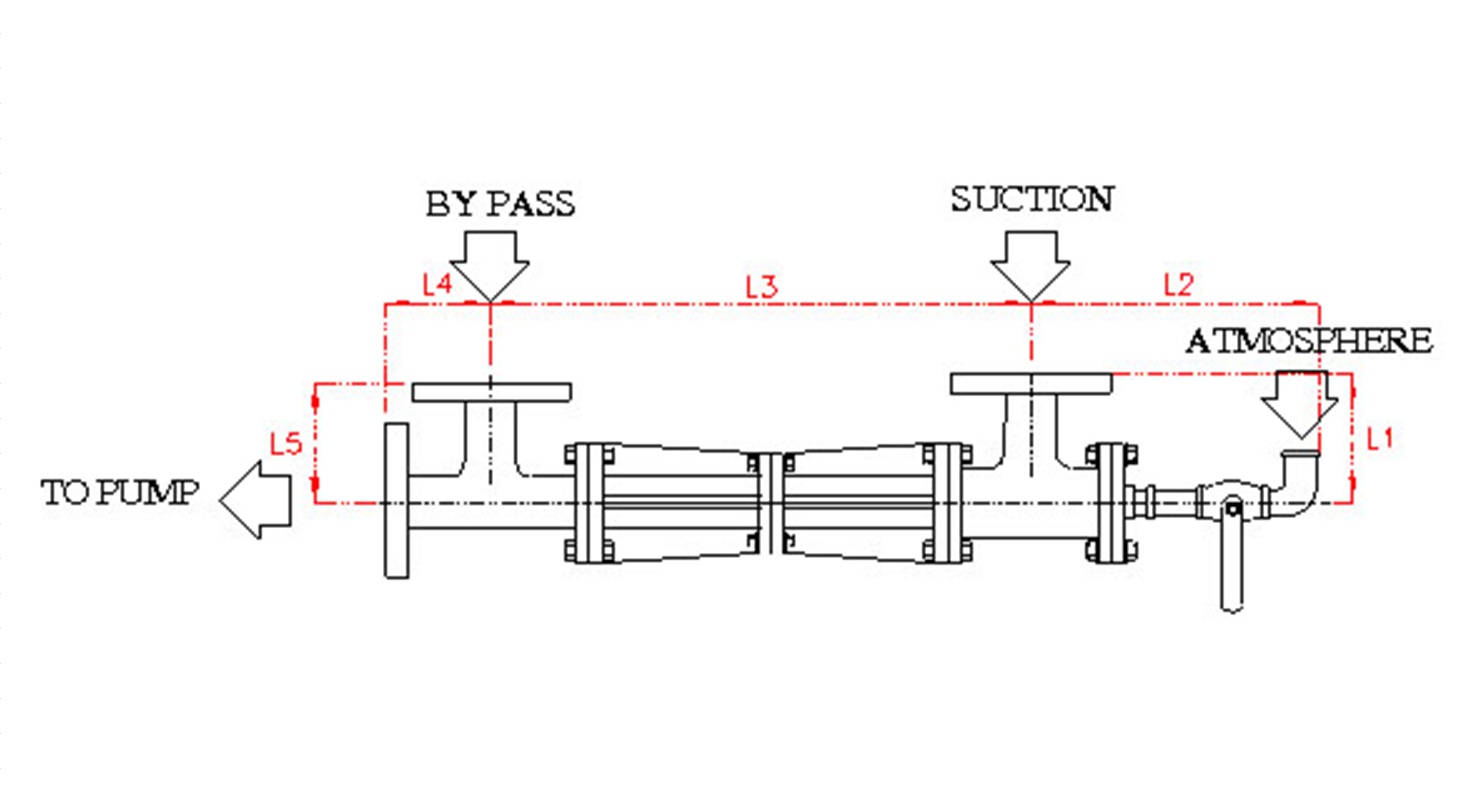 | Air ejector + Liquid ring vacuum pump | Hose power | Capacity | L1 | L2 | L3 | L4 | L5 | SUCTION | BY PASS | TO PUMP | |